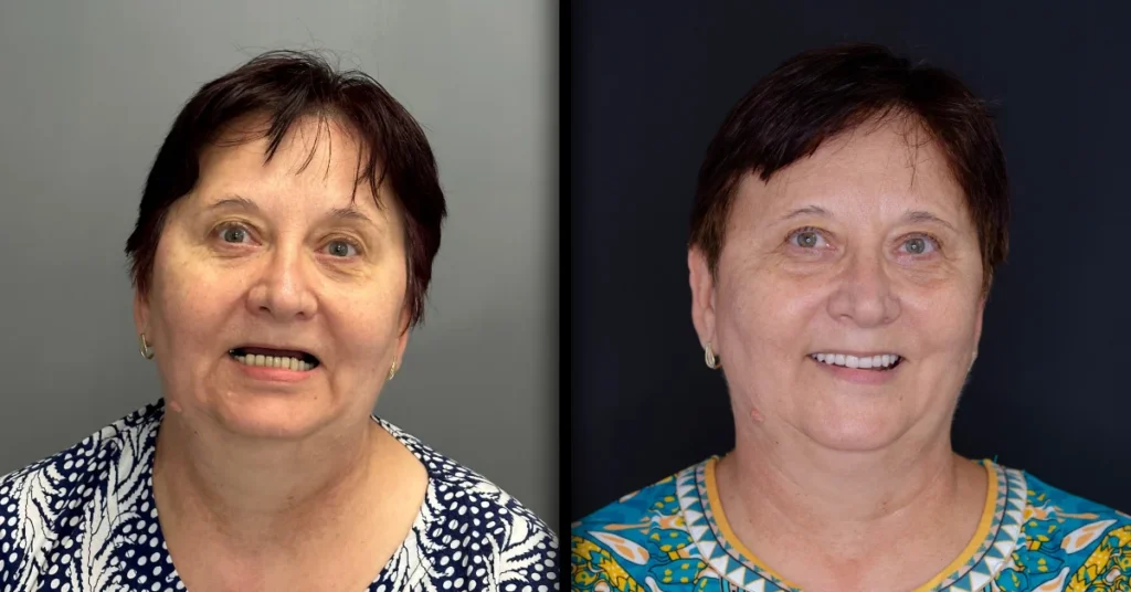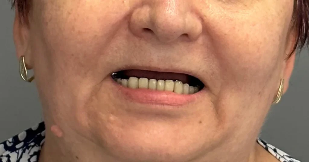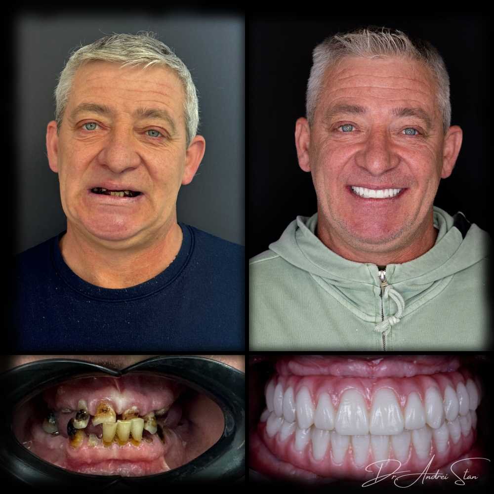 Doamna Cristea a venit la noi dupa ce a incercat patru proteze mobile pentru maxilar, fara succes. Am realizat o reabilitare completa pe 4 implanturi la maxilar, cu o lucrare provizorie fixa timp de 6 luni. Inainte de finalizarea tratamentului, au aparut probleme la puntea mandibulara existenta. Astfel, am efectuat si o reabilitare completa pe 4 implanturi la mandibula, pentru a putea finaliza lucrarile definitive simultan, obtinand o ocluzie perfecta si un rezultat estetic si functional optim.